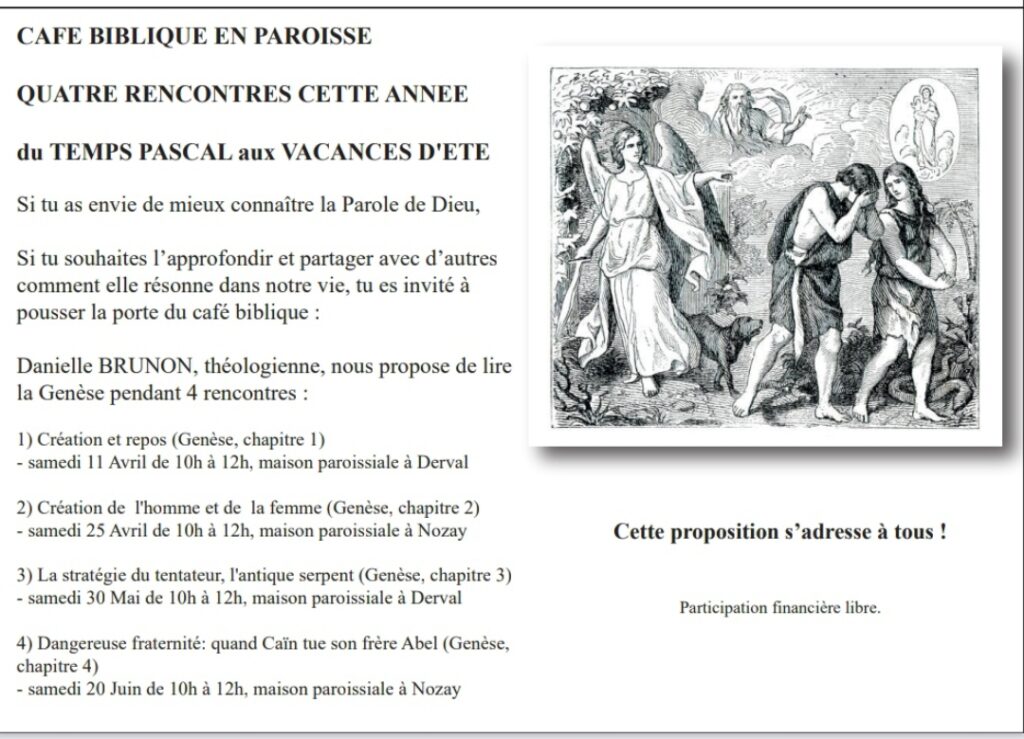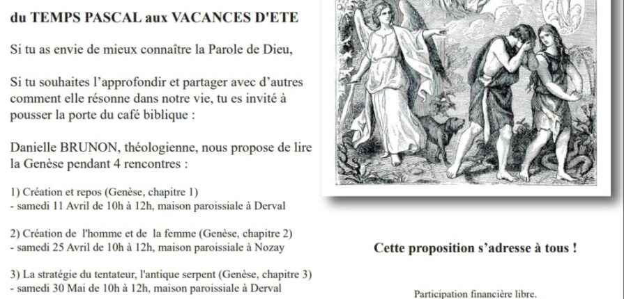 Du temps pascal aux vacances d’été, quatre rencontres nous sont proposées pour mieux connaître la Parole de Dieu. N’hésitons pas à pousser la porte du “café biblique” !