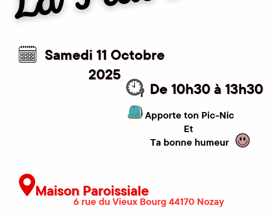 Si tu réponds oui, alors la Frat’ados est faite pour toi. Rendez-vous le samedi 11 octobre de 10h30 à 13h30 à la maison paroissiale de Nozay. N’oublie pas ton pique-nique.